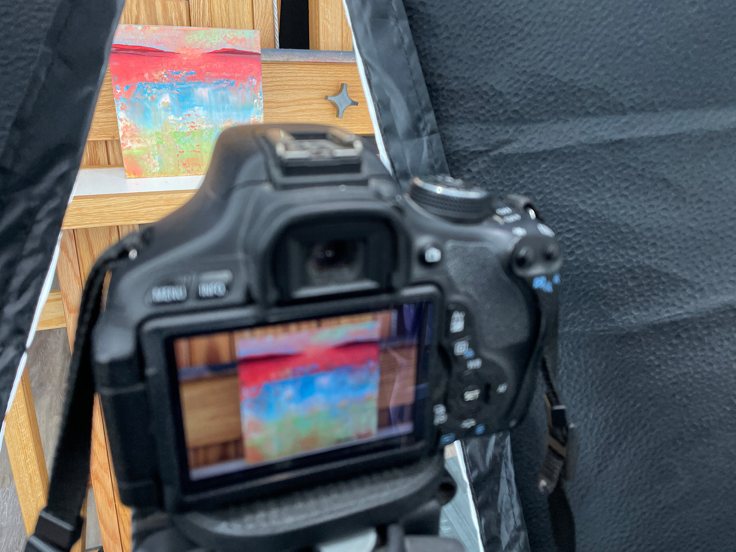 The next step is to photograph every painting so that I can get an accurate image to make them available to sell online. These photos are how I am able to offer my art as prints on canvas, paper and other merchandise like pillows and tote bags.
