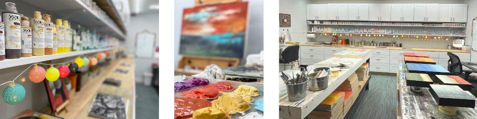 Each day, I work in my home art studio. I create original paintings using acrylic paint and texture medium on wood panels. Sometimes I like to create completely abstract colorful paintings, sometimes I like to turn them in to abstract landscapes and I love to make tree paintings too. For fun, I like to watch YouTube videos and try new media on paper in my sketchbooks.